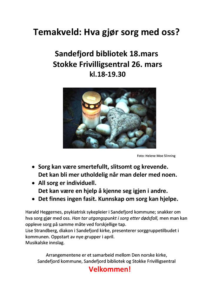 Harald Heggernes, psykiatrisk sykepleier i Sandefjord kommune; snakker om hva sorg gjør med oss. Han tar utgangspunkt i sorg etter dødsfall, men man kan oppleve sorg på samme måte ved forskjellige tap.